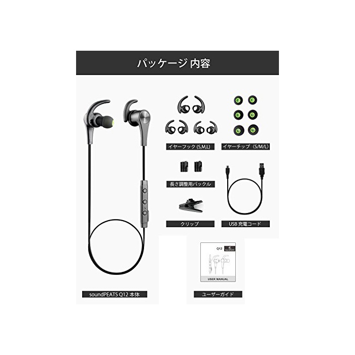 5) 【팩키지 내용】● Q12 Bluetooth이어폰(블루 tooth 이어폰)본체 ●이어 피스(S/M/L)※초기 장착M ●이어 훅(S/M/L)※초기 장착M ●carrying 파우치 ●USB충전 케이블 ●클립 ●결속용 파트 ●취급 설명서※전자판의 일본어 설명서도 준비 하고 있기 때문에,필요한 경우는 주문 번호를 기입하신 후,폐사로 연락 하십시오. 【대응 기종】Bluetooth(블루 tooth)기능 탑재 각종 디바이스로 대응.Apple iPhone7/iPhone7 Plus/iPhone SE/iPhone6s/iPhone6s Plus/iPhone6/iPhone5s등iPhone각 기종,iPad Pro/iPad Air/iPad mini등iPad각 기종,iPod각 기종,Sony Xpeira,Google Nexus,Samsung Galaxy,Asus,Fujitsu,Huawei등Android각 기종,Windows,Mac탑재PC등.