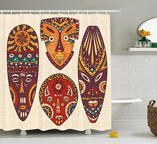 Tiki Bar Decor Shower Curtain by Ambesonne, Decorative Mask Designs African Aborigine Art Patterns Cultural Ethnic Print, Fabric Bathroom Decor Set with Hooks, 75 Inches Long, Multicolor