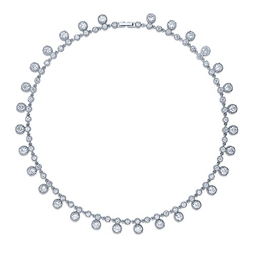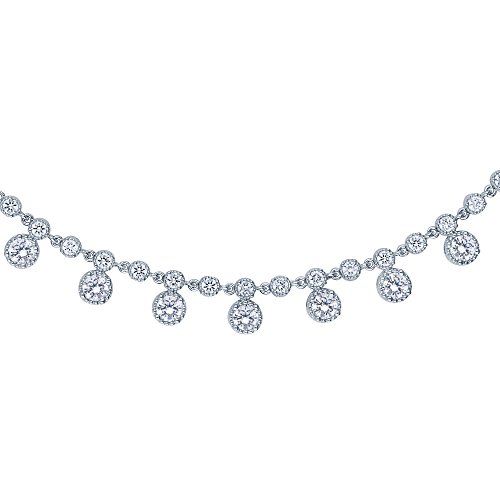 This statement necklace's mesmerizing sparkle and design are exactly what you need to make your special day even more memorable. Made of rhodium plated base metal. Set with 20.51 carat round cut clear cubic zirconia in crown setting. Necklace measures 17 inch in length. Fold over clasp. Imported.