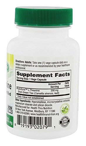 -. Binding : Health and Beauty -. Brand : Health Thru Nutrition -. EAN : 0819193020791 -. Feature : PhytoSureTM certified L-Theanine / Derived from Green Tea Leaf / NON-GMO & 100% natural / Free of carriers, additives, and synthetic adulterants / Exclusively Formulated and Manufactured in US cGMP certified facility. -. IsAdultProduct : 0 -. Label : Health Thru Nutrition -. LegalDisclaimer : These statements have not been evaluated by the Food & Drug Administration. These products are not intended to diagnose, treat, cure or prevent any disease. -. Manufacturer : Health Thru Nutrition -. MPN : HTN0791 -. PackageQuantity : 1 -. PartNumber : HTN0791 -. ProductGroup : Health and Beauty -. ProductTypeName : HEALTH_PERSONAL_CARE -. Publisher : Health Thru Nutrition -. Size : 60 Vegetable Capsule(s) -. Studio : Health Thru Nutrition -. Title : L-Theanine 200mg 60 Vegecaps Non-GMO (PhytoSure™ Certified) -. UPC : 819193020791
