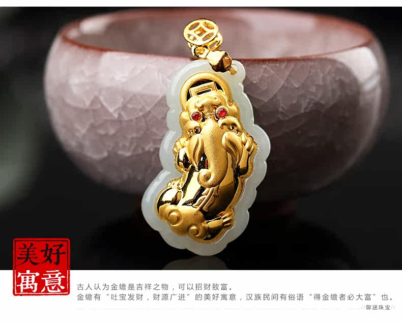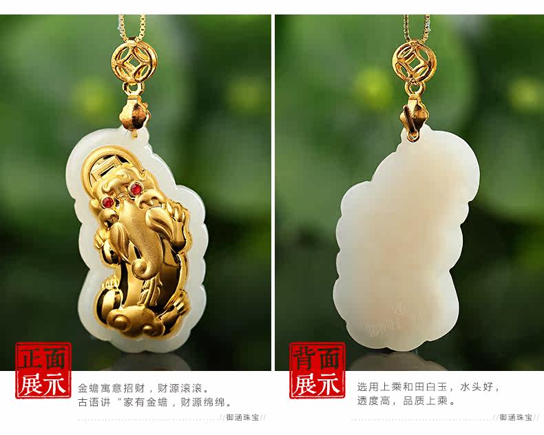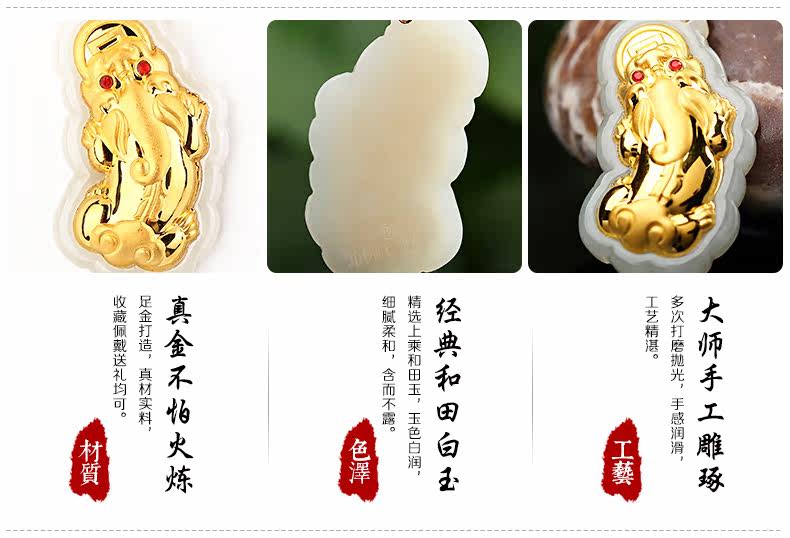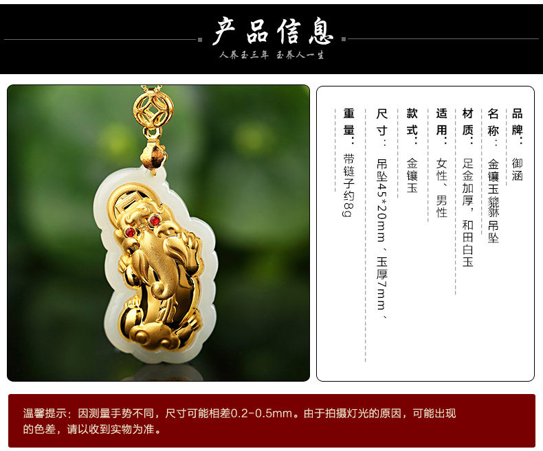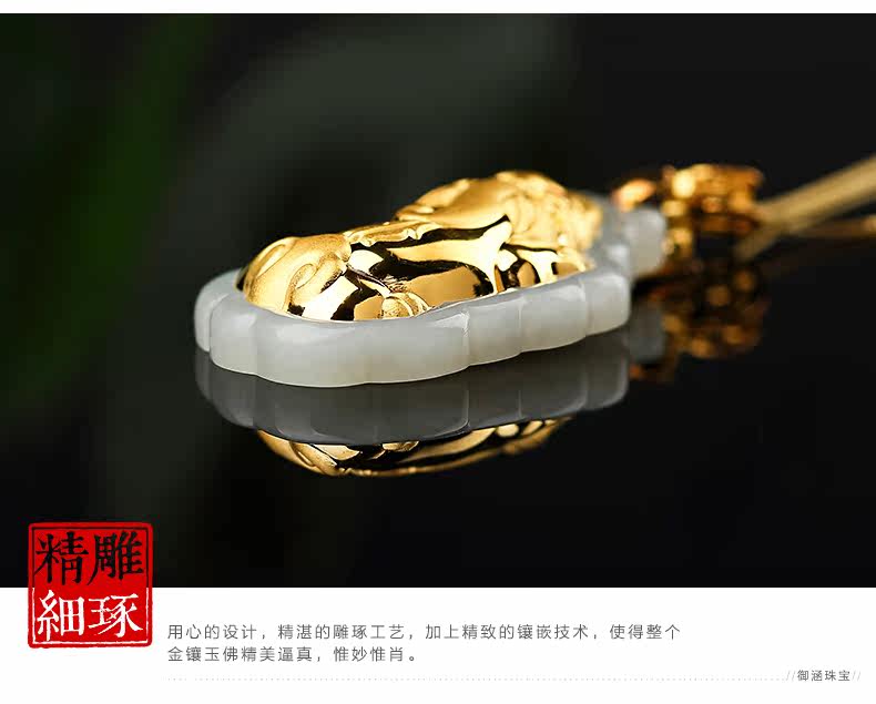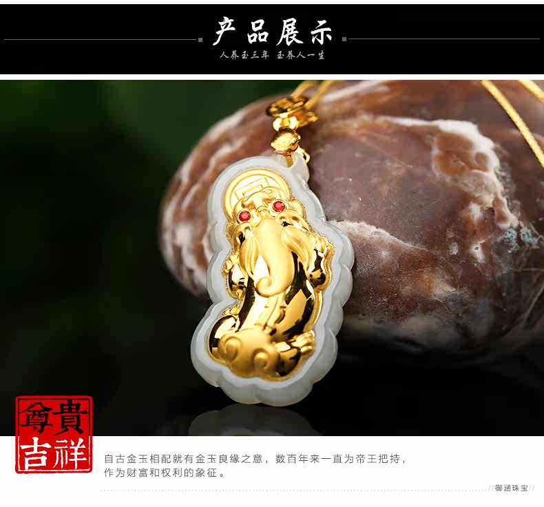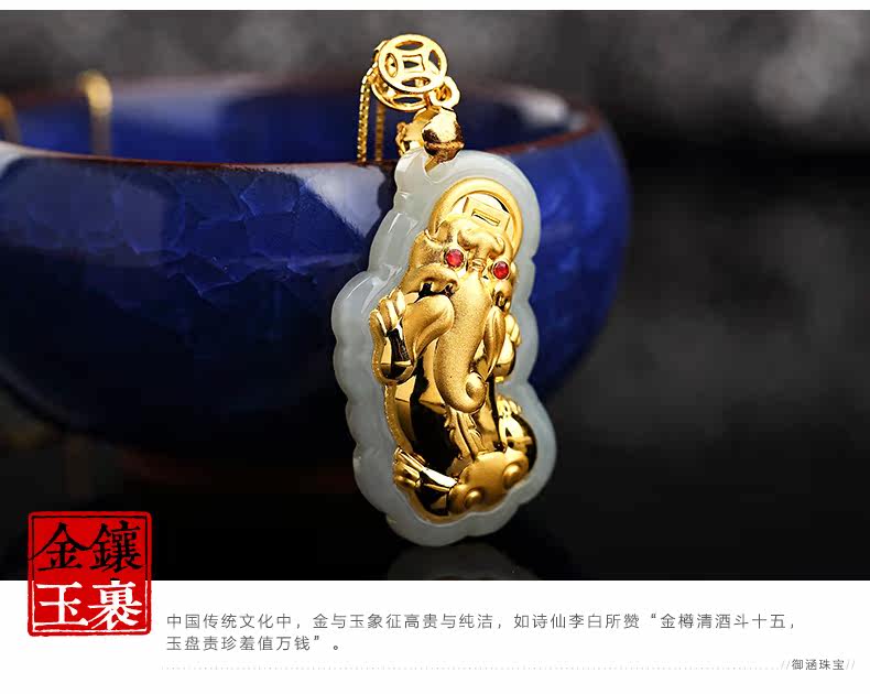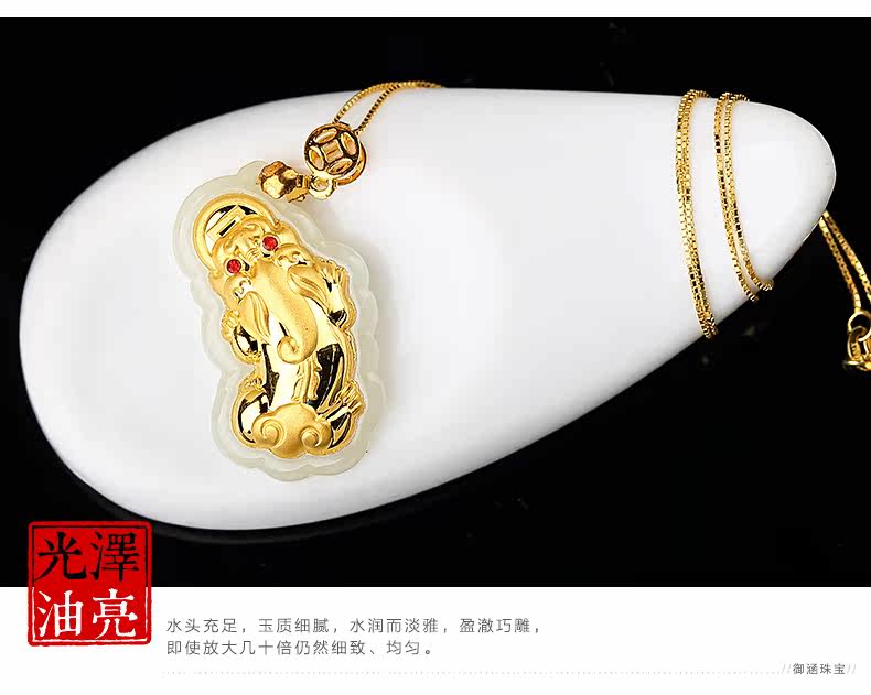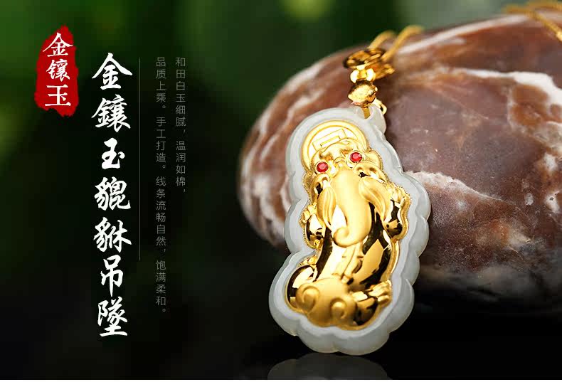 3D硬黄金金镶玉足金和田玉貔貅吊坠男女款 天然玉佩项