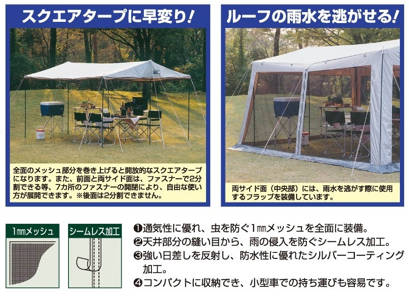 According to the situation, it is possible to develop with living tent, mesh tent, large tarp and various variations.
