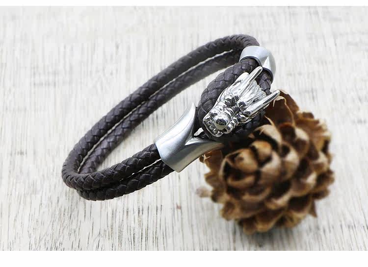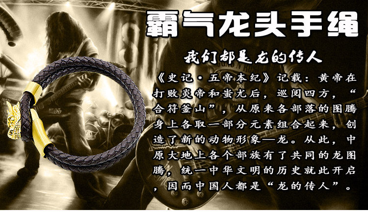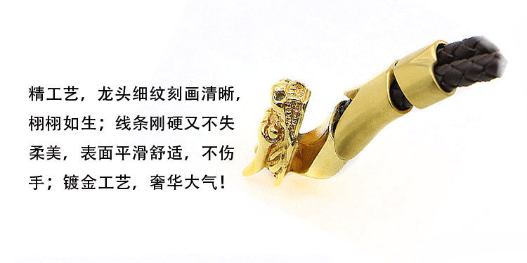 霸气龙头手镯男女真皮幸运手链18K金色钛钢手环编织绳 圈摇滚饰品