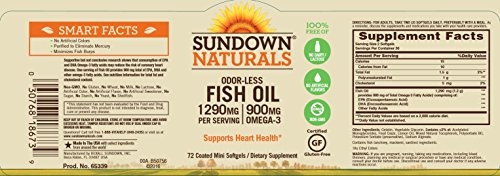 Sundown Naturals Odorless Premium Omega-3 Fish Oil 1290 mg provides you with eicosapentaenoic acid (EPA) and docosahexaenoic acid (DHA), two fatty acids that are known for their ability to support healthy heart and cardiovascular function.* Two mini softgels a day are all you need to contribute to healthy circulation, and help maintain healthy triglyceride levels already within a normal range.* These odorless softgels are coated to minimize any fishy aftertaste, and are purified to eliminate heavy metal contaminants such as mercury. Two mini softgels a day supply you with 900 mg of Omega-3s.Feature