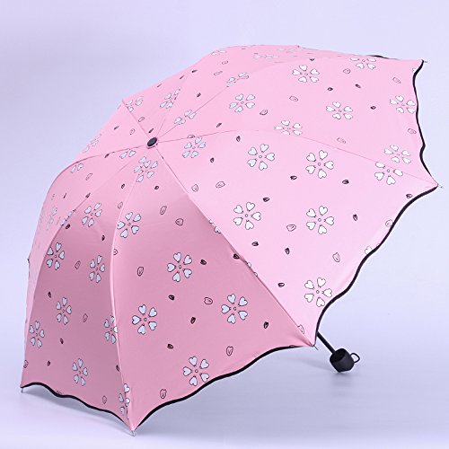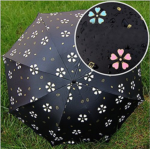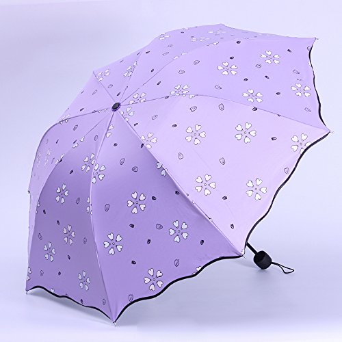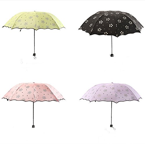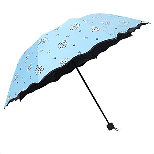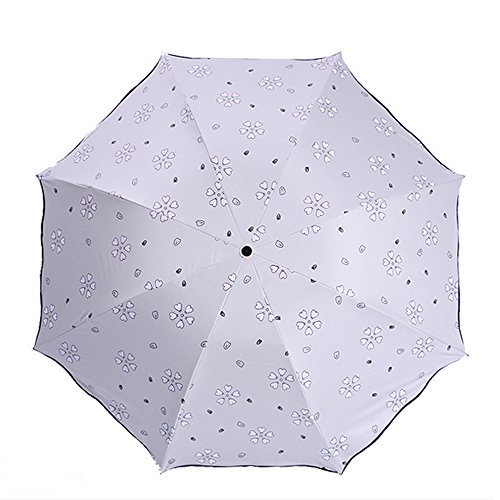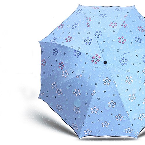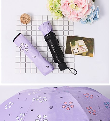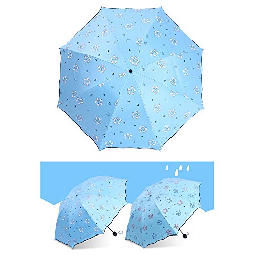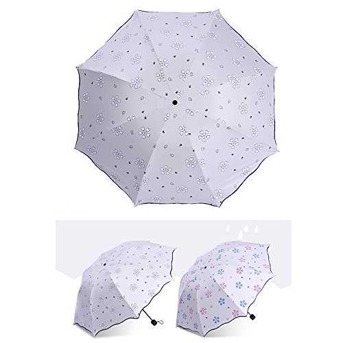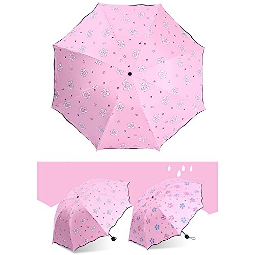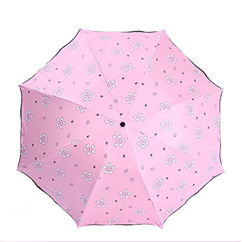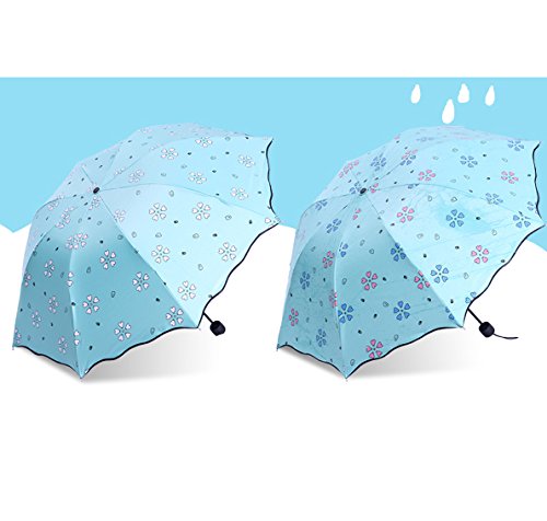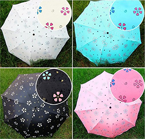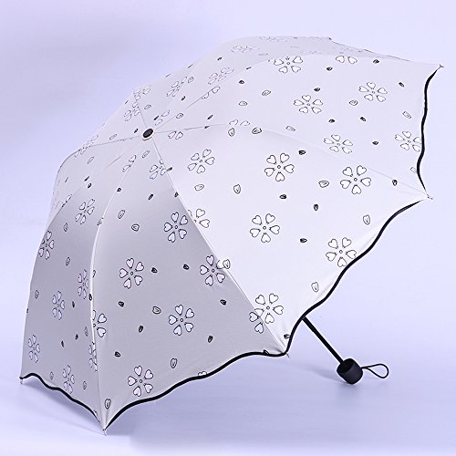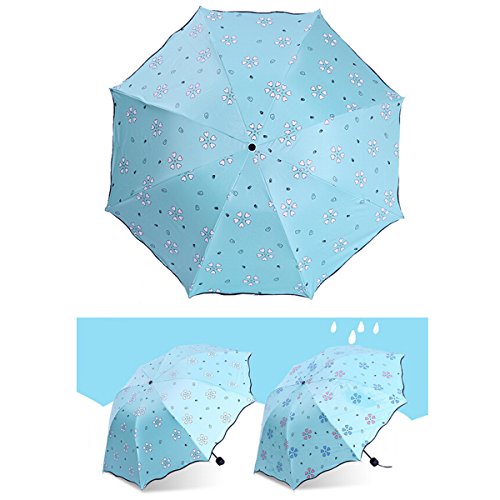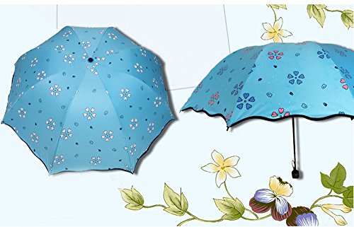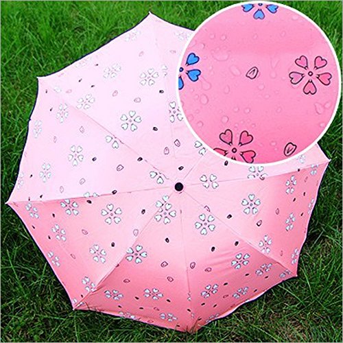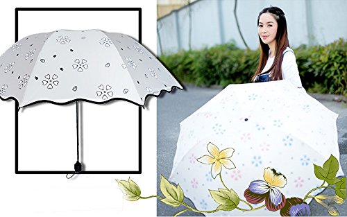 Our fashion three folds umbrella with unique color change design, surface with special printing flowers,when meet water the white flowers will changing to rainbow colors, appear as beautiful fashion colorful flowers as the picture shows,and will return to white when dry. Believe this adorable umbrella will surely cheer you up in any dismal weather.