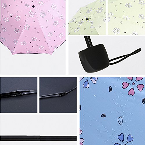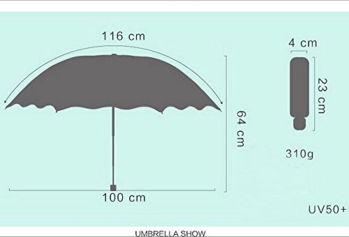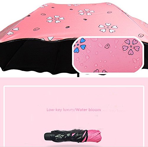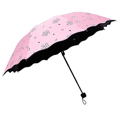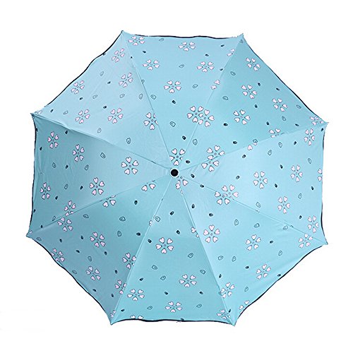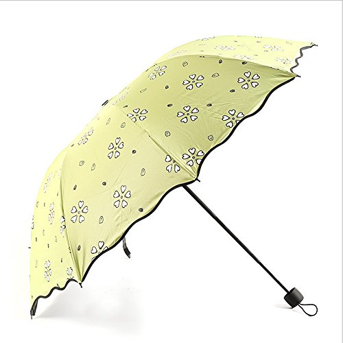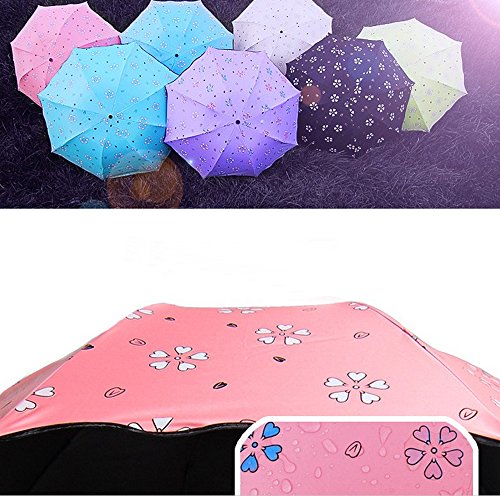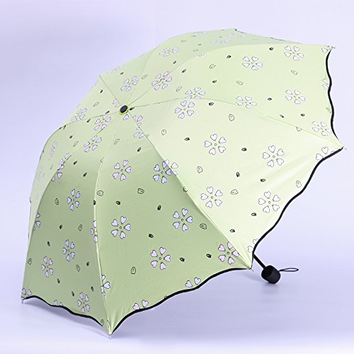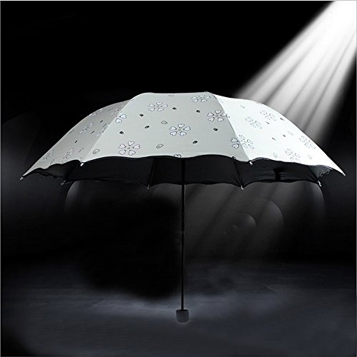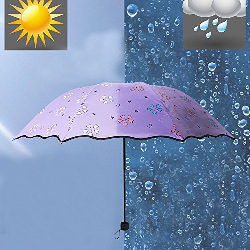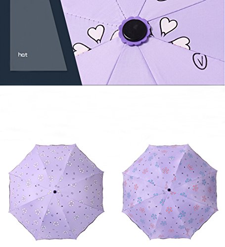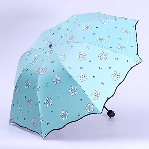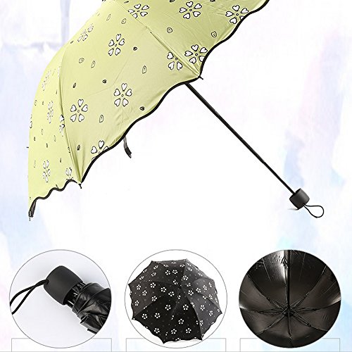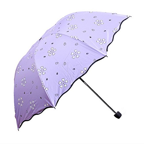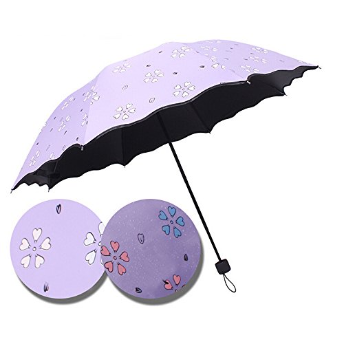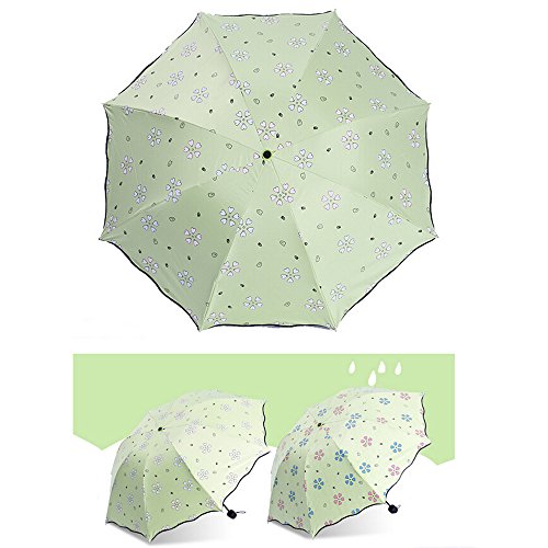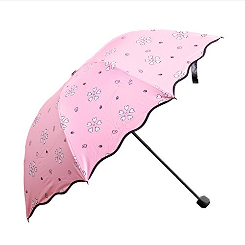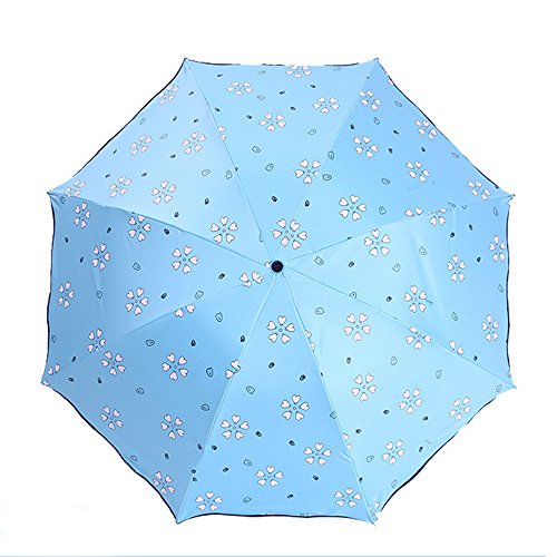 Our fashion three folds umbrella with unique color change design, surface with special printing flowers,when meet water the white flowers will changing to rainbow colors, appear as beautiful fashion colorful flowers as the picture shows,and will return to white when dry. Believe this adorable umbrella will surely cheer you up in any dismal weather.