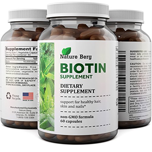 -. Feature : HELPS IN PREVENTING HAIR LOSS - Have you ever dreamt of having healthy locks? Nature Berg Biotin contains 10,000 mcg of pure and potent biotin, which can help prevent your hair from falling. It also helps with maintaining your hair's natural color. / PROMOTES TISSUE AND MUSCLE REPAIR - The B Vitamins including Vitamin B has the capacity to strengthen the body's muscles and tissues, leading to growth. This promotes stronger nails and clearer skin - you've got the best of both worlds! / SUPPORTS BRAIN FUNCTION - Biotin or Vitamin B7 aids in signaling the nerves when it comes to neurotransmitter activity. It then helps with sharpening the memory, so you would always remember that special time in your life. / REVS THE METABOLISM - This supplement helps in converting food into energy, thus speeding your metabolism, which can aid in successful weight loss. It also converts carbohydrates and sugar into fuel, which can make your energy go up. / MONEY BACK GUARANTEE - We never want our customers to be disappointed! We can always give your money back if you ever feel that our supplements didn't meet your standards. Try a bottle now and let us know how it goes!