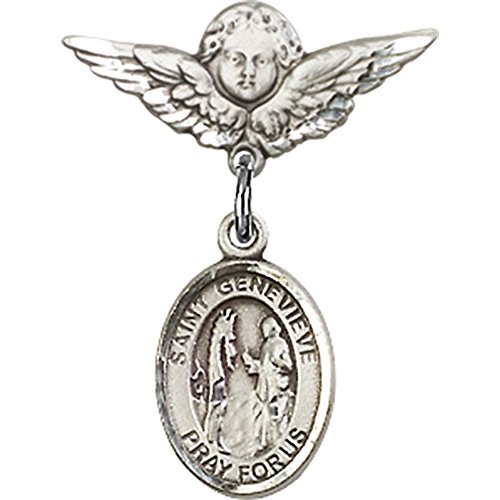 -. Title : Sterling Silver Baby Badge with St. Genevieve Charm and Angel w/Wings Badge Pin 7/8 X 3/4 inches
