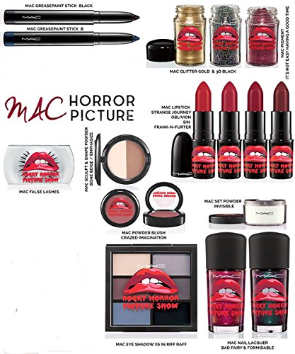 Studio : MAC Publisher : MAC Binding : Misc. Product Description MAC Rocky Horror Collection. YOU'LL RECEIVE A COPY OF THE RECEIPT TO PROVE AUTHENTICITY. You'll receive the following: 4 lipsticks :Strange Journey Yellowish brick red (Matte).Oblivion Vivid bluish-red (Amplified) Sin Deep dark blue red (Matte).Frank-N-Furter Deep raspberry wine (Matte).1 Riff-Raff Eyeshadow Palette Graphic Style Deep silver (Veluxe Pearl) oh, Rocky!!! Soft muted white with pearl (Frost)Carbon Black Intense black (Matte) Heavy, Black and Pendulous Grayish blue with pearl (Frost)Blackberry Muted burgundy-plum brown (Matte) Crystal Violet duochrome with pearl (Frost).2 Glitters Gold Sparkling chunky gold.3d Black Black with silver holographic effect.1 Pigment It's Not Easy Having a Good Time Sparkling burgundy.2 Greasepaint Sticks B Bright yellow blue. Black Intense black. 1 Powder Blush Crazed Imagination Muted plum with a hint of pink pearl. 1 Sculpt and Shape Powder Bone Beige/Emphasize Palest cream/tan.2 Nail Lacquers Bad Fairy Red with red multi-changing pearl.Formidable Teal green with pink multi-changing pearl. 1 (7 Lash Limited Edition Packaging).1 Invisible set powder ONLINE ONLY. Total of 16 Mac Limited Edition Hard to find items. New in Boxes. 0
