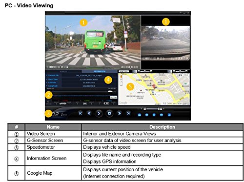 The internal G-sensor records sudden acceleration/sudden brakes/ sudden curves. The saved information can be checked using the video recording software view-I PC Player.
