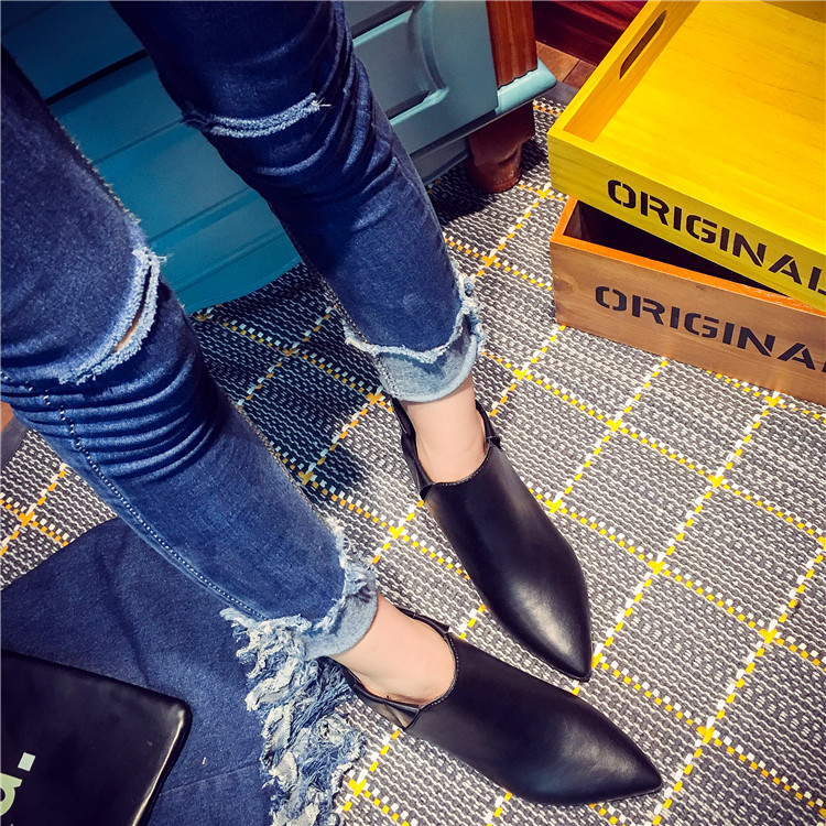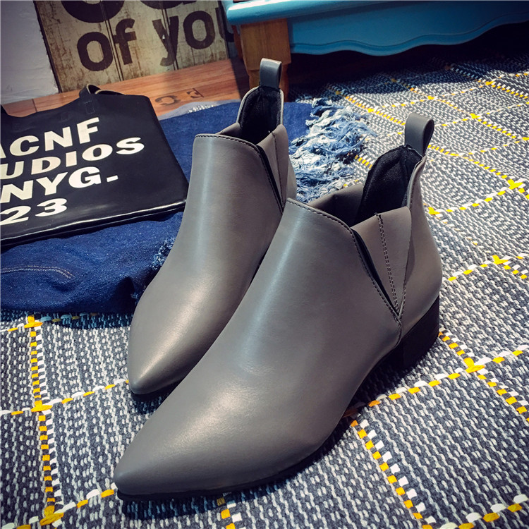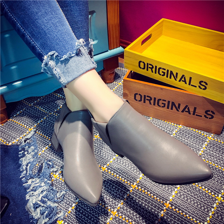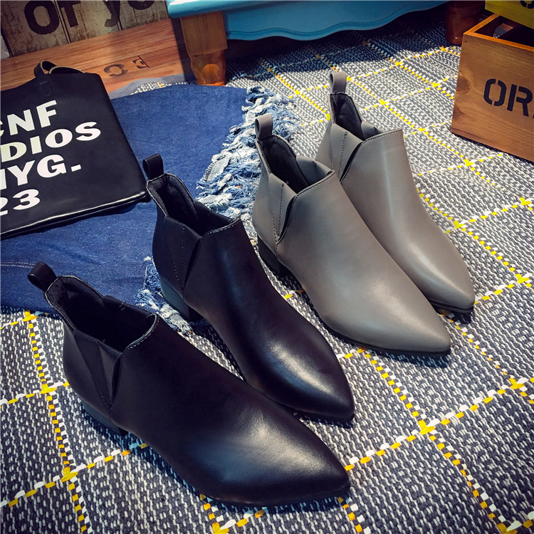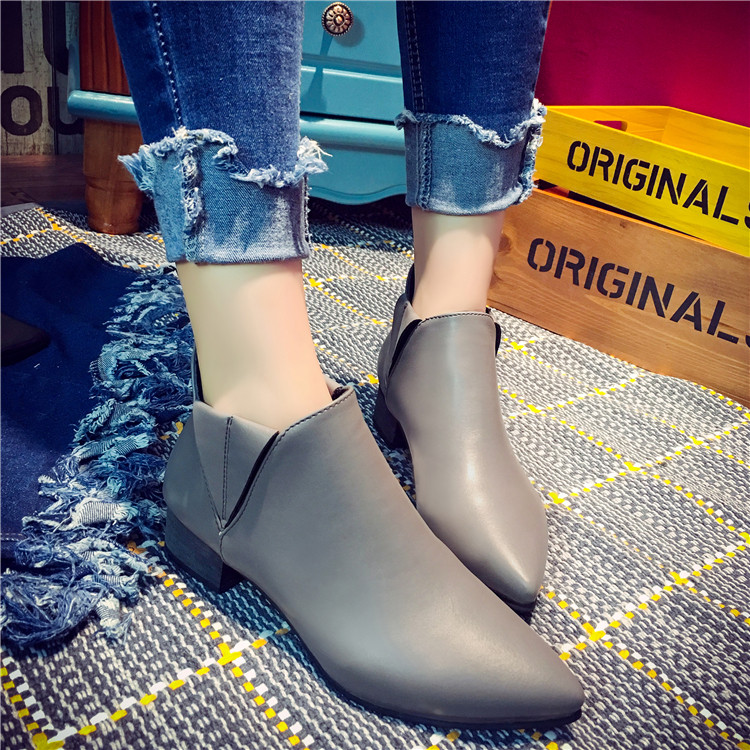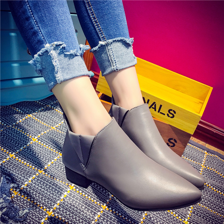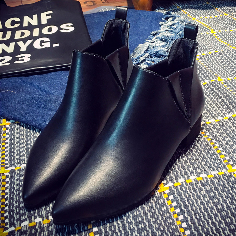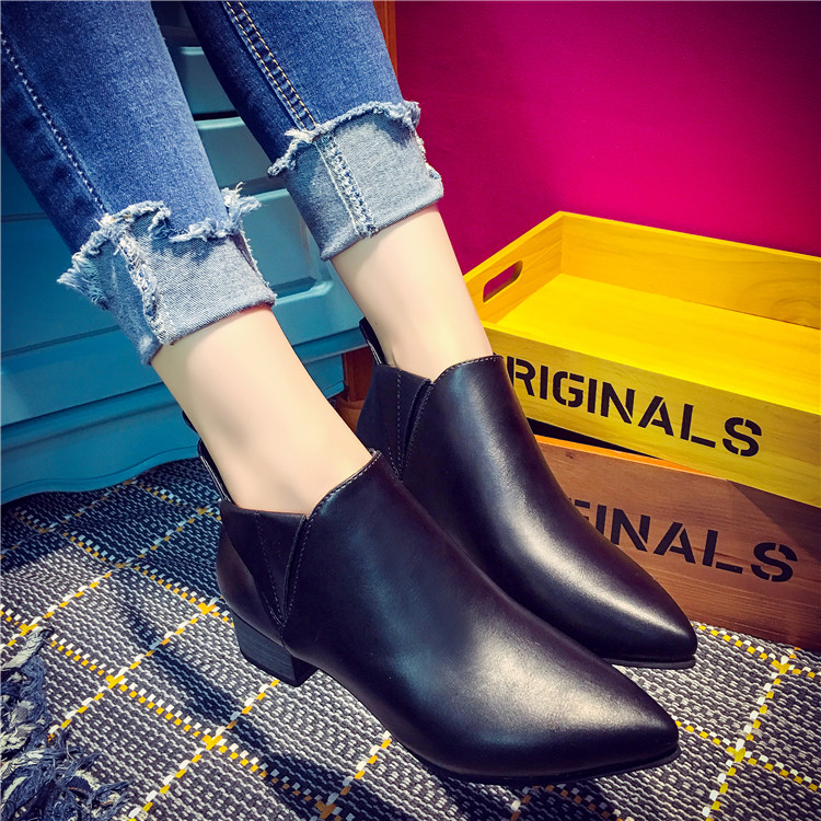 韩版短筒靴女马丁靴子秋冬季中跟尖头厚底单鞋及踝裸靴黑色机车靴