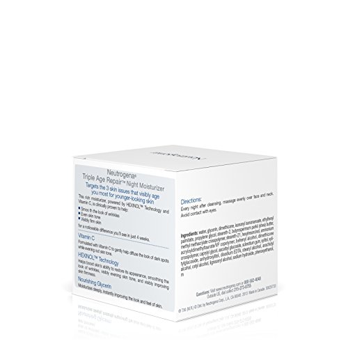 Help wake up to younger looking skin with Neutrogena Triple Age Repair Moisturizer. This night moisturizer targets the three skin issues associated with aging for a difference you'll see in just four weeks. The formula contains Hexinol technology and vitamin C that are clinically proven to help smooth the look of wrinkles, even skin tone, and visibly improve skin firmness.Feature