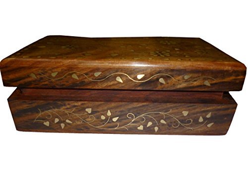 -. Feature : Dimensions: Length - 6 inches; Width - 4 inches; Height - 2.5 inches / Crafted using one of the finest richly hued timber Rosewood and further adorned with appealing brass inlay floral designs. / The box comes with a velvet inner lining and a brass latch to keep the contents scratches free and secure. / Store your valuables like personal jewelry or family heirlooms and add a touch of class to your dressing table. / Handmade by skilled artisans from Saharanpur - India's largest hub for high quality wooden handicrafts.