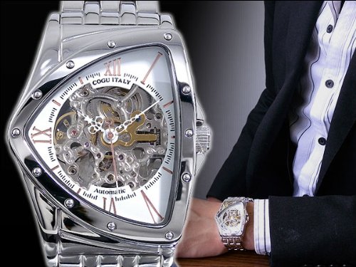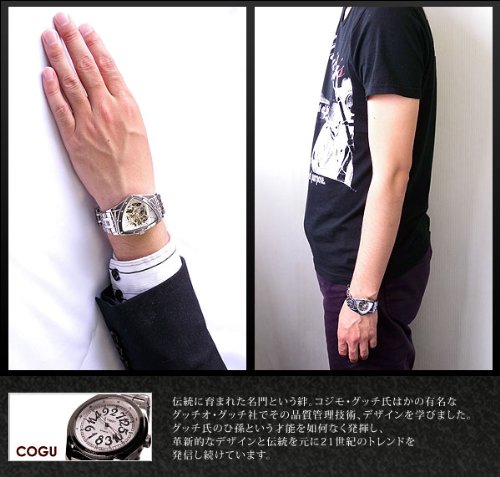 COGU cog 상품 사양:(H×W×D) 약43×37.5×14mm 약158g 팔 주위 약16-21cm 스테인레스 자동 감기(태엽 부착)고, 3기압 방수,스켈리턴 케이스,보증서,취급 설명서