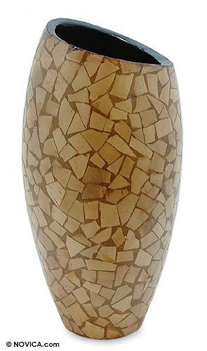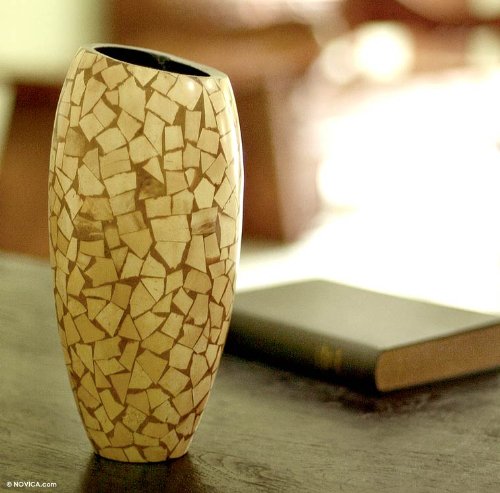 NOVICA, in association with National Geographic, works together with talented artisan designers around the world to produce stunning, keepsake treasures. Our mantra is to spread global happiness, so rest assured - we’ll do everything we possibly can to ensure you’re a happy customer. About this item: Ketut Sukayasa designs a vase of stately elegance as he exalts nature's exquisite beauty. He carves the vase by hand of albesia wood, ideal for its dark, rich grain. Using chippings from coconut shells, Sukayasa creates an elaborate mosaic of hypnotic allure. - For decorative use only - Not watertight About our Artist: Artisan Ketut Sukayasa was born to a farm family in a village in Bali. 'I'm the youngest of four children and the only one to become an artisan,' he recalls. 'After I finished secondary school, I decided to try and make a living from handcrafted art. I use coconut shells, bamboo, and other readily available materials. Then I also started to make decorative tableware. Although I've been creating handcrafted work for people to enjoy, I haven't had time to decorate my own home. I'm just too busy!'Feature