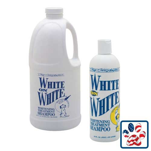Gets the yellow out! unlike other whitening shampoos, white on white can be used on all coat colors! this product is an optic intensifying treatment within a shampoo, removing all yellow stains with a lustrous sheen on darker colors. Contains no bleaching agents, harsh chemicals or softening agents.Feature