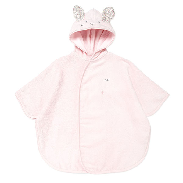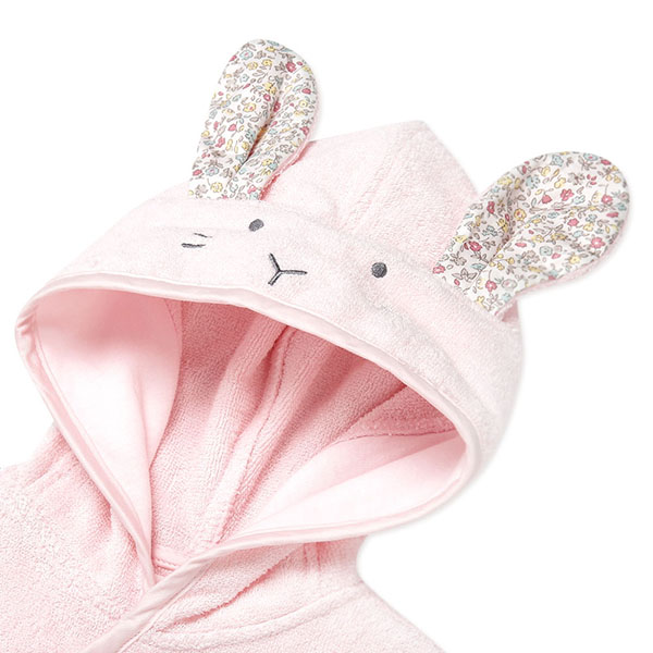 고깔부분에는 귀여운 토끼 얼굴과 플라워 패턴의 입체귀로포인트를 준 사랑스러운 스타일의 목욕가운입니다.