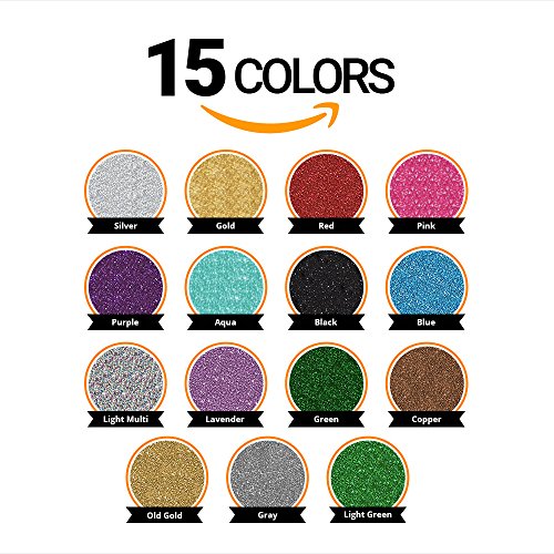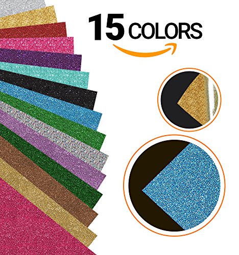 Glitter Heat Transfer Vinyl Bundle Sheets | 15 Colors | 12 x 9.8 inches | Suitable for Iron-on, Silhouette Cameo, Heat Press, Cricut Machines, T Shirts | Durable and Long Lasting Adhesive