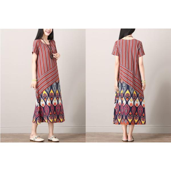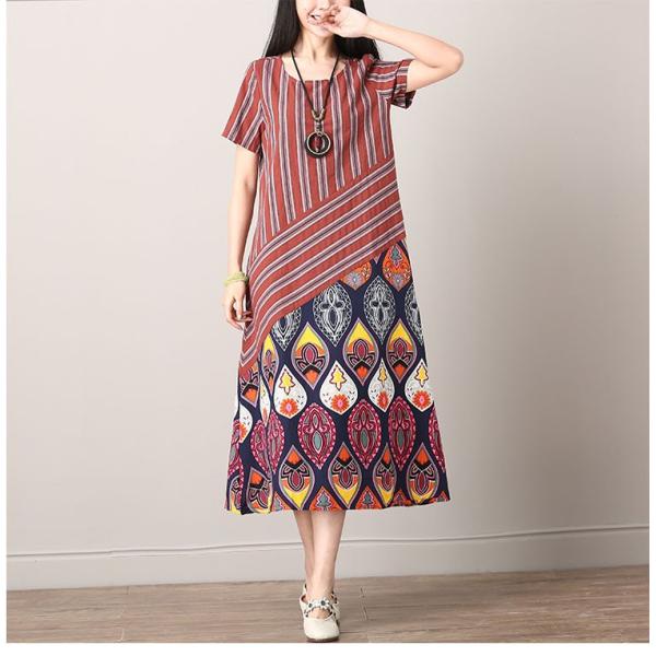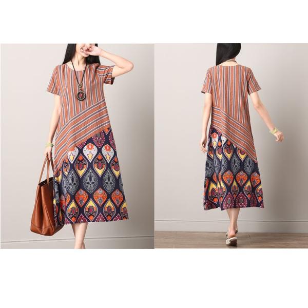 ストライプとプリント柄デザイン切り替えのレトロな雰囲気漂うワンピース。
