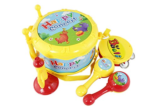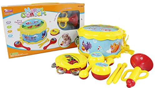 Lightahead® 4 in 1 Musical instrument set for toddler and kids. Educational tool to bring joy and happiness for your baby. Helps develops baby's sense of touch, develop baby's sense of hearing, and develops baby's hand-eye coordination. The set includes drum with drum sticks, horn, bell and maracus. The top of the drum can be unscrewed and can also be ued as storage box. Material: ABS+PP. Please note that the actual product color may vary from the picture.Feature