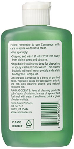 -. Binding : Sports -. Brand : Sierra Dawn -. EAN : 0045048011021 -. Feature : Travel clean and light with the original, super-concentrated all-purpose cleaner for travelers / Use as a bath soap and shampoo, to wash and spot-clean clothes and to clean anything washable / Made from natural vegetable-derived ingredients with natural essential oil fragrance; Makes a great helper around the house too! -. IsAutographed : 0 -. IsMemorabilia : 0 -. Label : Sierra Dawn -. LegalDisclaimer : Use kindly with due care -. Manufacturer : Sierra Dawn -. Model : 2 -. MPN : 371460 -. NumberOfItems : 1 -. PackageQuantity : 1 -. PartNumber : 371460 -. ProductGroup : Sports -. ProductTypeName : OUTDOOR_RECREATION_PRODUCT -. Publisher : Sierra Dawn -. Size : 4-ounce -. Studio : Sierra Dawn -. Title : Sierra Dawn Campsuds All Purpose Cleaner, 4-Ounce -. UPC : 855020000024