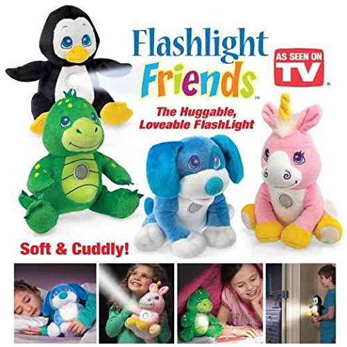 -. Feature : Flashlight Friends are soft, plush, cuddly animals with built-in flashlights / Perfect gifts for children 4 years and up, they are great for nighttime games, Storytime, sleepovers and other after-dark activities / Handy to use for nighttime trips to the bathroom and kitchen, they are also great for kids who are afraid of the dark / Available as penguin, dragon, puppy or unicorn / Each measure 8 1/2" tall and uses 3 AAA batteries (sold separately)