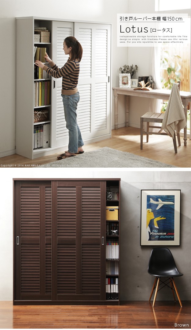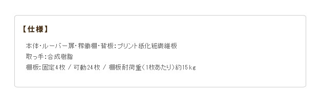 商品について:引き戸ルーバー扉のブックシェルフ。引き戸タイプなので扉の開閉スペースがとれない場所にも設置OK。通気性の良いルーバー扉で大切な本を湿気から守ります。可動棚は耐荷重(1枚あたり)約15kg、3.2cmピッチで高さ調節ができます。固定棚x4箇所、可動棚x24枚。