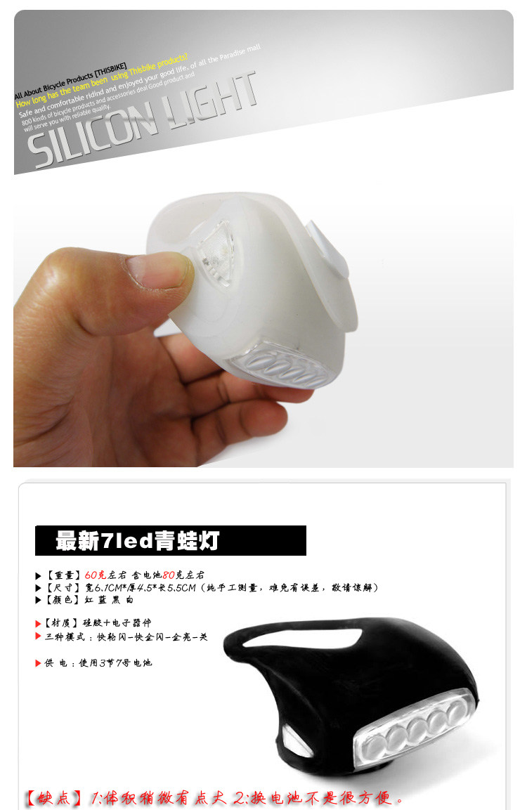 【特点】这个青蛙灯有7个LED,5白色LED+2红色LED 。红色的2个LED在2边,5个白色的LED在前面。晚上亮起来非常漂亮。亮度非常好,可以做警示前灯。