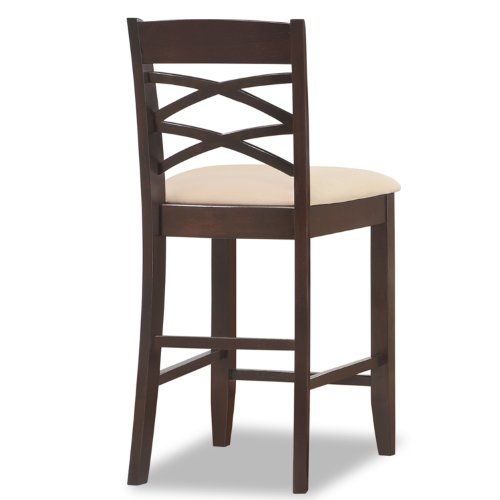 -. Title : Leick Wood Double Cross Back Counter Height Bar Stool with Beige Microfiber Seat, Set of 2