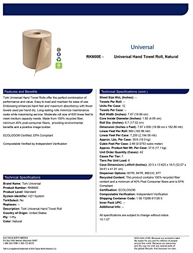 -. Title : Tork Universal RK600E Hardwound Paper Roll Towel, 1-Ply, 7.875" Width x 600' Length, Natural (Case of 12 Rolls, 600 per Roll, 7,200 Feet)