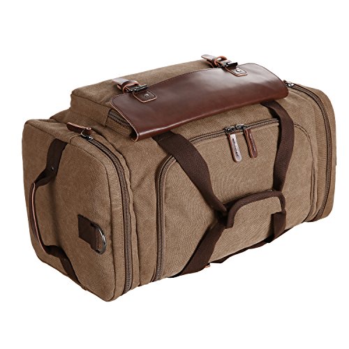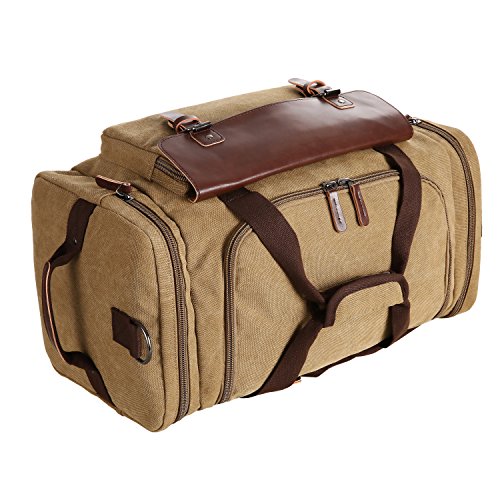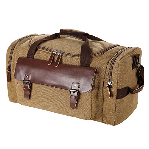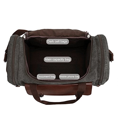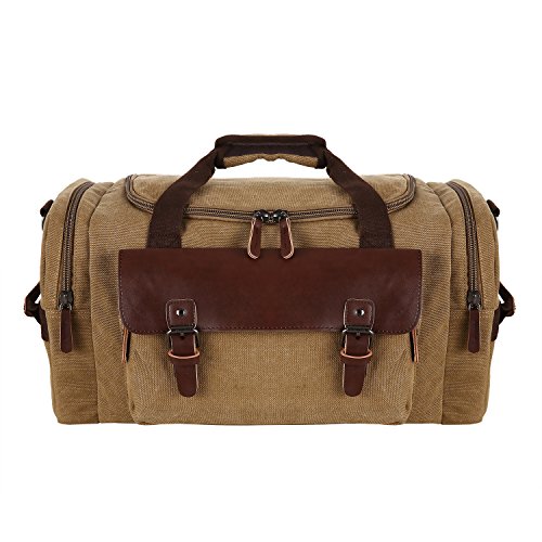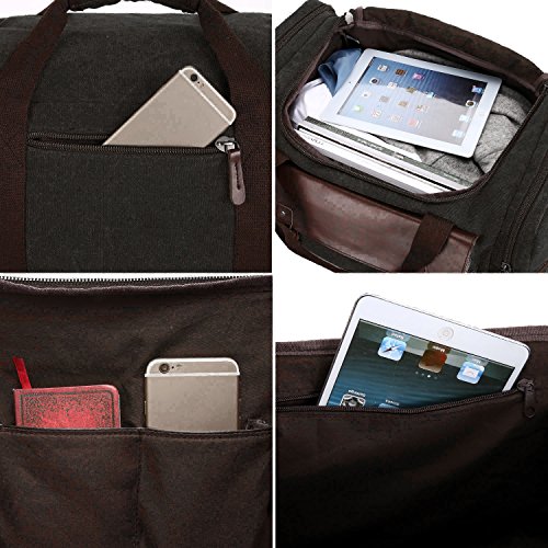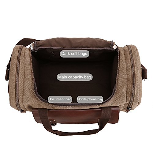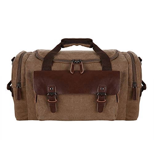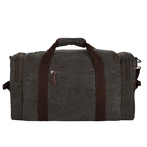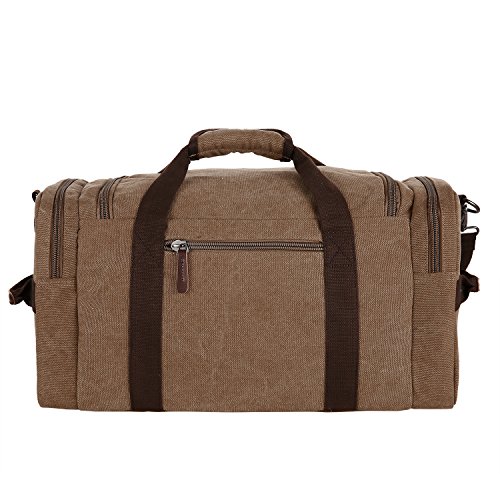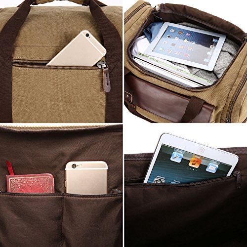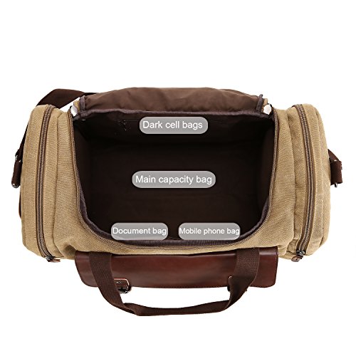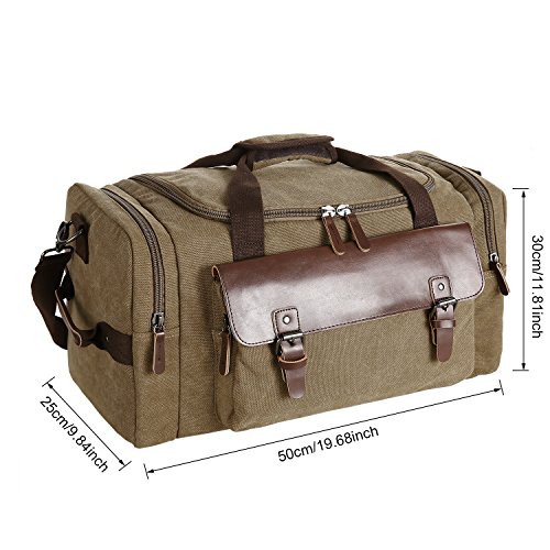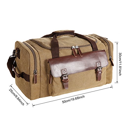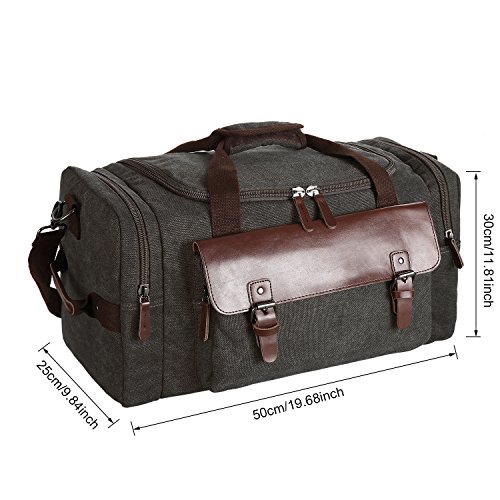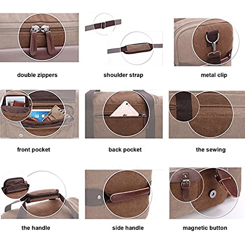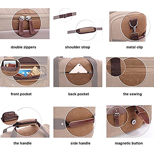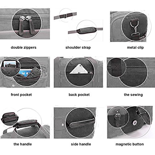 Features - Fashion vintage design, well sewn craftsmanship. - Made of high density cotton canvas and zips, robust, classic and fashion. - Three layers of lining which provides strong load-bearing. - Scientific and reasonable pocket lining design make your goods lay in the bag systematically. - Large Capacity, you can carry all your laptop, A4 books, clothes and other daily necessities, perfect for travelling or gym. - Freely adjustable shoulder strap buckle, you can adjust it according to your height and comfort requirements. -Padded shoulder strap tab which is comfortable when carrying on your shoulder and may release the stress from the bag. - Comfortable handle on the top of the bag, it can be used as a tote bag.