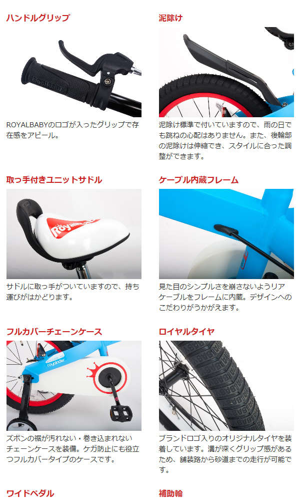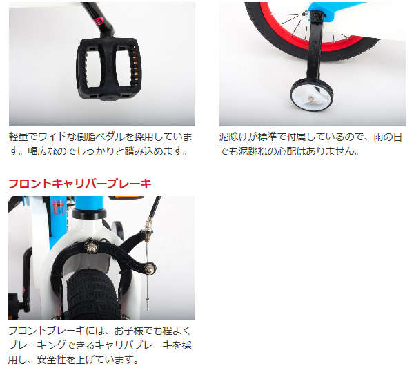 ●取り外しが簡単に出来る組立式バスケット、伸び縮みできる泥除け、トレーニングホイールを標準装備。