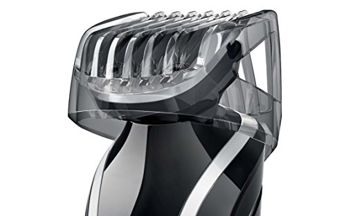 The Philips Norelco Multigroom 5100, All-in-One Trimmer (Model # QG3364) is a turbo-powered grooming kit that provides maximum versatility for the exact style you want. This all-in-one multigroomer has 7 tools for all-in-one face and head styling, including a full-size metal guard trimmer, hair clipping comb, beard comb, stubble comb, mini foil shaver, detail trimmer and nose trimmer. The self-sharpening blades made of finely ground Chromium steel ensure long-lasting performance while skin-friendly rounded blade tips and combs prevent skin irritation. The 18 build-in length settings gives you everything you need to create any head or facial style you want. The turbo boost feature delivers fast results, even on thicker hair. Lithium-ion battery stays charged for up to 60 minutes of trimming after a 1 hour charge. The device is fully washable, simply rinse device under faucet for easy cleaning. Multigroom 5100 comes with a 45 day risk-free trial and a full 2-year warranty. Packaging includes: electric trimmer, full-sized metal guard trimmer, detail trimmer, nose trimmer, mini-foil shaver, hair-clipping comb, beard comb, stubble comb, cleaning brush, power cord, and travel pouch.Feature