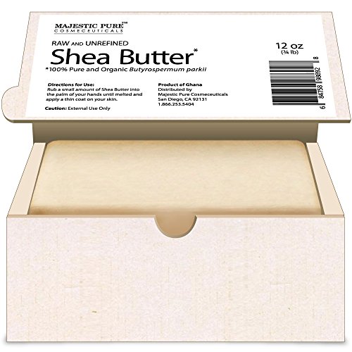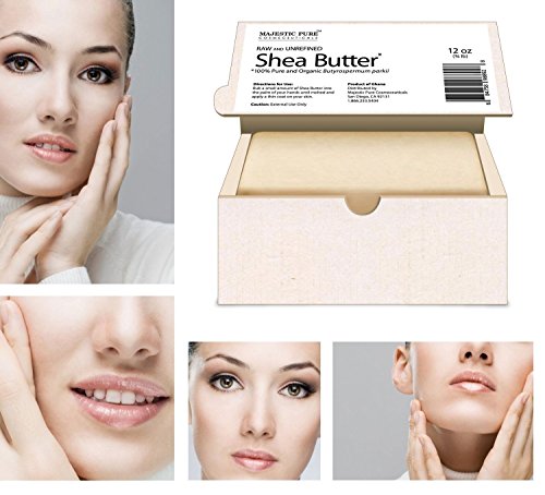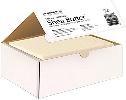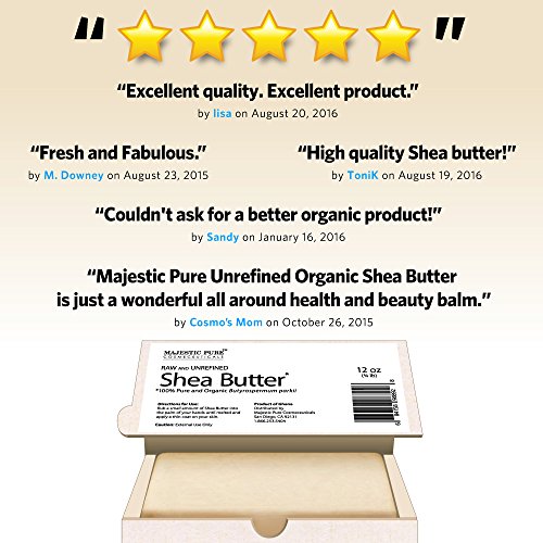 Endless Benefits Of Majestic Pure Organic (Cut) Shea Butter to Skin And Hair. Shea butter is a solid fatty oil that is derived from the nuts of Karite trees and have gained huge popularity due to its widespread use in several beauty products such as lotions, cosmetics, shampoos, conditioners and many more. Shea butter exhibits several health benefits particularly for the skin and hair. Shea butter is also used in shaving cream for smooth silky shave, as a natural cuticle cream, on the lips or in homemade lip balms, as a natural baby-care product or ingredient in baby care recipes, in homemade liquid creme foundation and makeup, On the hair or scalp, and On sore/raw noses during a cold or flu. This African Shea butter offers other Anti Aging benefits to promote overall healthy skin. Unrefined or raw Shea butter is the purest form of Shea butter which is most natural and retains its vitamins, minerals and other natural properties. Majestic Pure Organic Unrefined Shea Butter is CUT Shea Butter, Not Melt and Pour, Preserving best possible efficacy. It is the highest quality raw Shea Butter available today on the market. Loaded with anti aging ingredients such as Vitamin A, E and F, it offers amazing benefits to skins and hairFeature