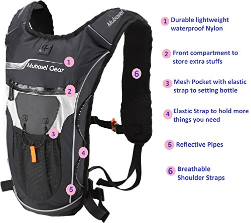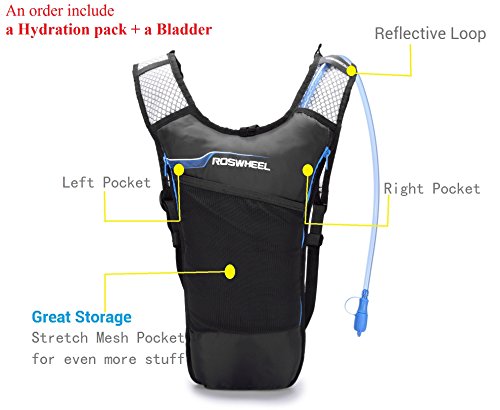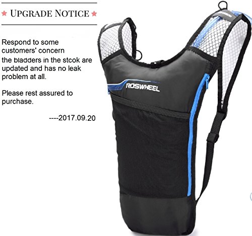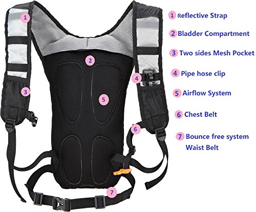 -. Feature : 1.PERFECT SET - The order Include an FDA APPROVED bladder & a Pack / 2.SUPER LIGHT - Weight 0.77 lb with 2L bladder in high quality of the workmanship & Nylon material, it definitely won't burden you when sporting / 3.GOOD VOLUME - Pack Size:18 * 11.5* 0.8 inch, includes 2 storage compartments (16.5 * 9.85 inch) that will fit your clothes, keys, purses, phones etc. For even more storage, the front stretch mesh pockets allows you to pack even more on your hike / 4.MULTIPLE USAGE BLADDER - It can bear the weight of 132 lb, you can use it as pillow if need to rest lying down outside, the opening is large enough to add ice cubes for chilling / 5.WON'T LEAK - As long as the screw between the bladder and the straw tightened well so as the opening, it won't leak at all