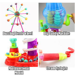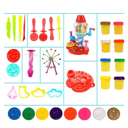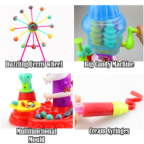 Making your own Colouful candy creations is easy and fun! Place your compound in the fantasy gumball machine to crank out over 50 colorful clay gumballs. Once you're done, put one of your Clay gumballs in the stamping station to press out fun, colorful candy shapes. Ready for more? Pop your fantasy gumballs into the licorice presser and squeeze out crazy swirly licorice sticks! Twist your Clay licorice around one of the included pop sticks to make Clay lollipops. With so many options, your Candy Cyclone playset can provide you with endless hours of silly gumball-swirlin', candy-makin' fun