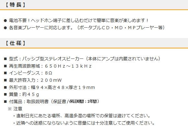 fk094igrjsヘッドホン端子に差し込むだけで簡単に音楽が楽しめますポータブルCD・MD・MPプレーヤー等各音楽プレーヤーに対応しています サイズ 個装サイズ:11×15×2cm 重量 個装重量:75g 製造国 中国 電池不要で楽しめるステレオプラグインスピーカー ヘッドホン端子に差し込むだけで簡単に音楽が楽しめますポータブルCD・MD・MPプレーヤー等各音楽プレーヤーに対応しています fk094igrjs