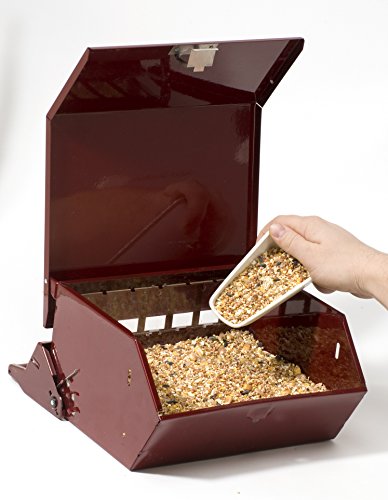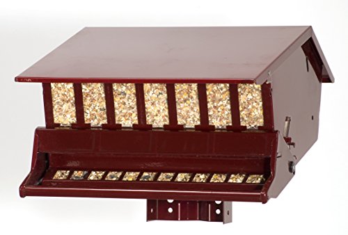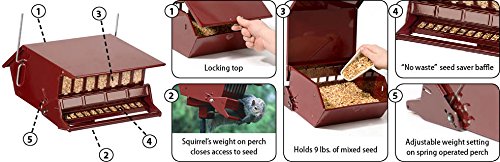 -. Feature : Adjustable weight setting on the sP.R.Ing operated perch closes squirrels access to seed / Durable power coated steel body / Pole mounting hardware and hanger included, pole sold separately / Locking top / No waste seed saver baffle. holds 9-pound of mixed seed. seed sold separately / No waste seed saver baffel / Holds 9 lbs. of mixed seed