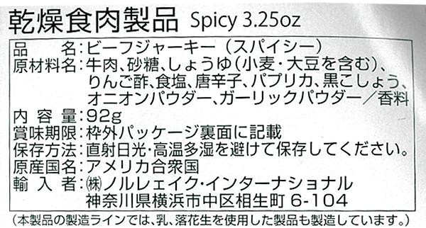 | 原材料 | 名称:ビーフジャーキー(スパイシー)/乾燥食肉製品 牛肉、砂糖、しょうゆ(小麦・大豆を含む)、りんご酢、食塩、唐辛子、パプリカ、黒こしょう、オニオンパウダー、ガーリックパウダー/香料 |