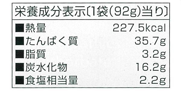 | 栄養成分 | 【1袋(92g)当り】 熱量:227.5kcal、たんぱく質:35.7g、脂質:3.2g、炭水化物:16.2g、食塩相当量:2.2g |