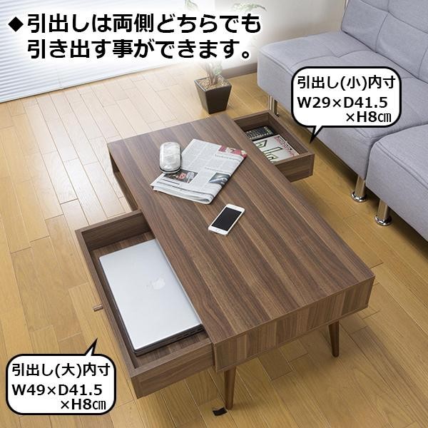 大小2つの引出しが付いた、リビングテーブル。