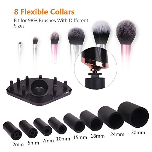 - 【8 Collars to fit 99% Makeup Brushes】 -- The makeup brush cleaner comes with 3mm, 5mm, 7mm, 10mm, 15mm, 18mm, 24mm and 30mm collars, which can work with 99% makeup brushes in the market, the SMALLEST 3mm collar to work with your thinnest makeup brush.