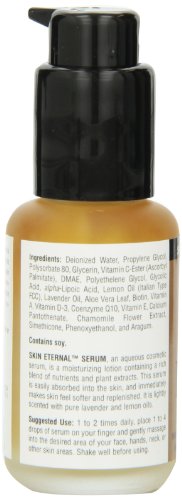 スキンエターナルセラムは純粋なラベンダーとレモンオイルで軽く香りがしていて、他の局所製剤では利用できない栄養素とハーブが含まれています。これらにはアロエベラ、アルファリポ酸、ビオチン、CoQ10、DMAE、MSM、ビタミンA、C-エステル、D-3とE、そしてカモミールが含まれます。