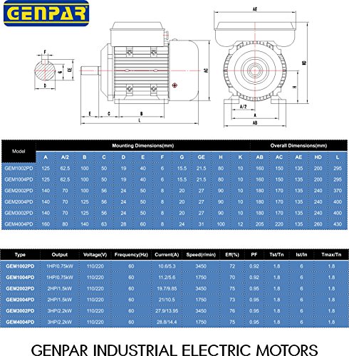 1HP 1750RPM GENPAR Electric Motor 1 Single Phase Type Industrial for HEAVY DUTY Applications BALL BEARING 4 Poles Dual Voltage 110/220V Universal Fan Compressor Pump Machines 1 HP GENERAL PURPOSE USE