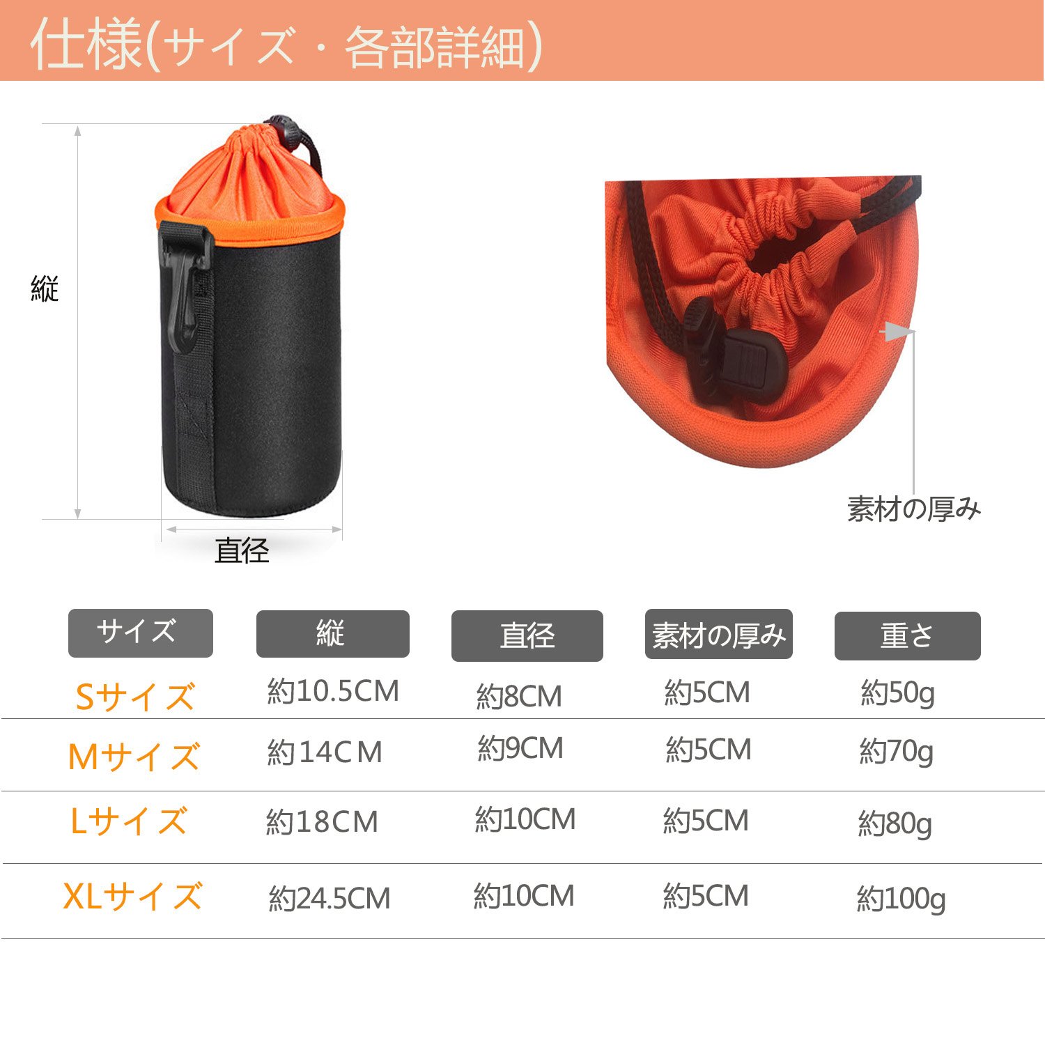 XL size: (approx) diameter 10 cm × height 24.5 cm (for telephoto)