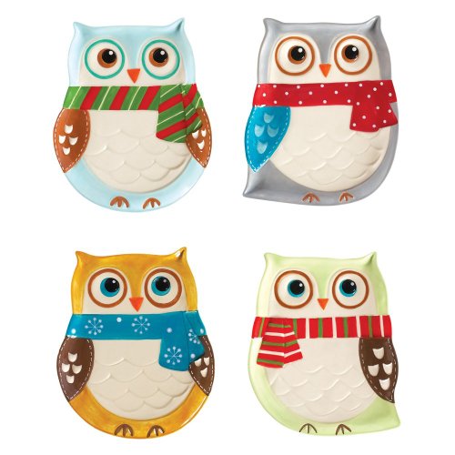-. Feature : Made from earthenware / Each plate features a different owl with a Christmas scarf, including one blue owl, grey owl, tan owl and a light green owl / Perfect for winter decor / Creative idea for home entertaining / Hand wash recommended