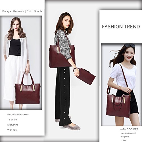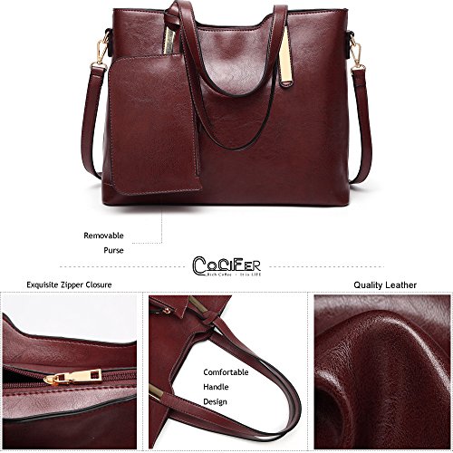 100% New Tote Purse of COCIFER Brand! Outer Material: High Quality Greased Leather This is faux leather, so it is normal of a little leather smell, putting it in well-ventilated areas or putting in some orange peel for few days , then the smell will disappear Inner Material: Polyester Closure: Zipper Main Purse Size: Approx 13.8*11'H*5.2'W / 35*13*28CM (Fit up to 13' laptops) Smaller Removeable Purse Size: Approx 7.5*4.7 inches (L*H) / 19*13CM Height of Handle: 8.7'/22CM(long enough to put on shoulder) Size may be 2 cm/1 Inch in accuracy due to hand measure Occasion: Versatile Size may be 2 cm/1 Inch in accuracy due to hand measure; ----------------------------About The Return Policy---------------------------- COCIFER offer convenient after-sales service: If customer receive broken, damaged or wrong item, customer only need to send a picture to us will be ok, and then we will refund or resend in 24 hours,and customer need not to return it to us. If customer dislike the item, we can offer return, or give several suggestions that we think is better or more convenience. if for other reasons, we encourage our customer contact us, we will response in one business day and do our best to service you. 0