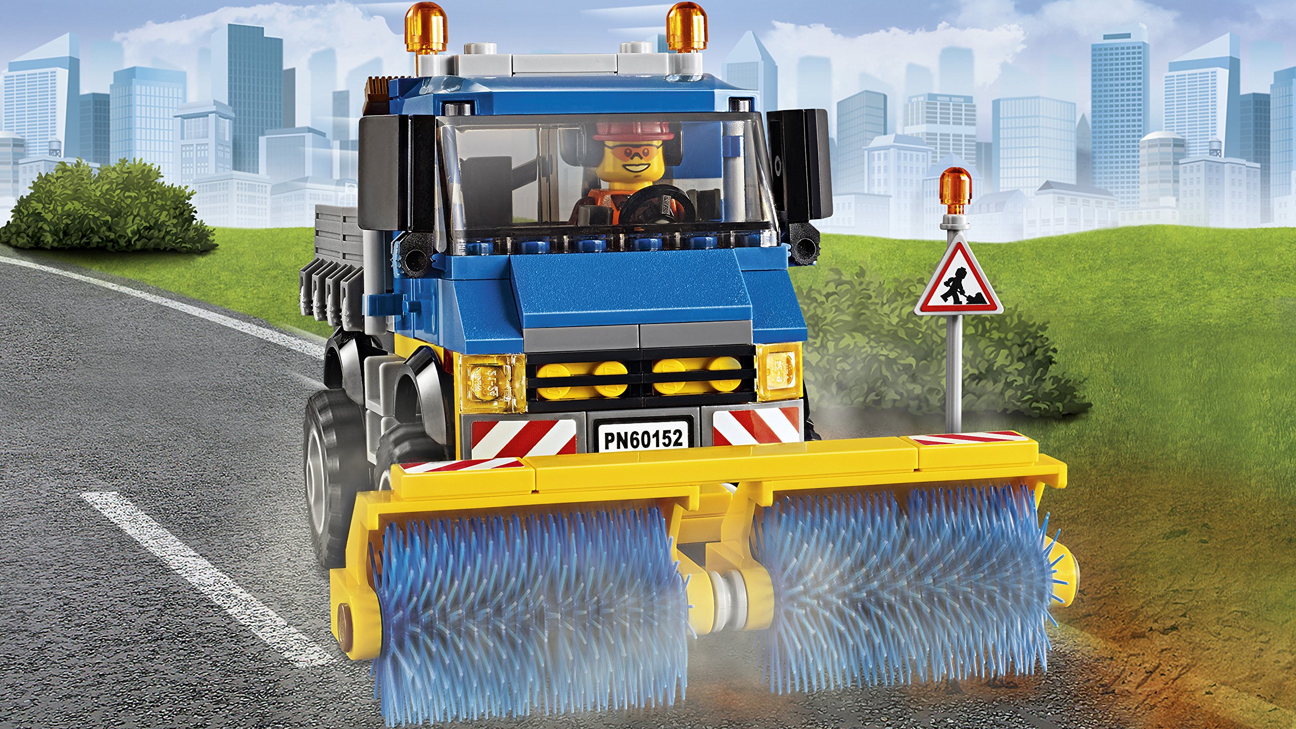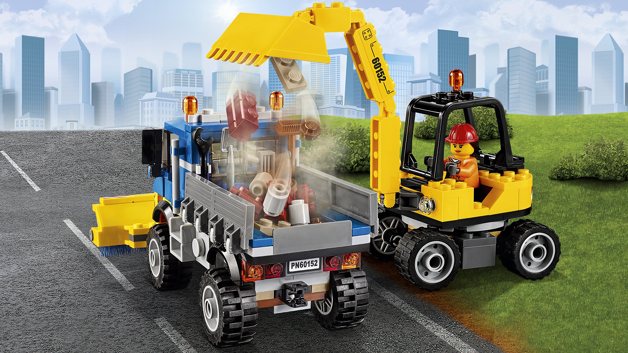The block is blocking the street! You need a sweeping car and a power shovel! Place the power shovel on the trailer and transport it with the truck to the site.