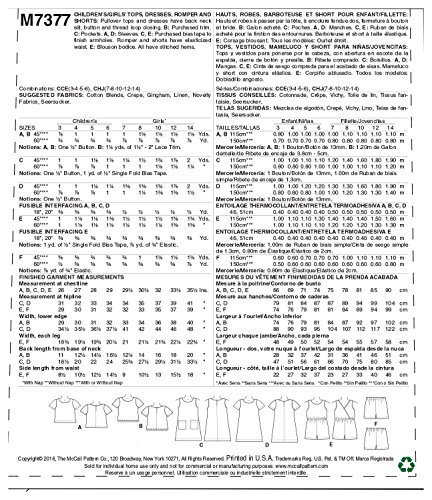 -. Title : M7377 Girls' Tops, Tent Dresses, Blouson Romper & Shorts (3-6) SEWING PATTERN