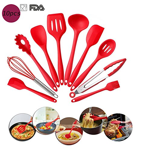 -. Feature : ★HIGH QUALITY--Silicone cooking utensils are 100% FDA Grade and BPA Free.Can be used up to 480°F and non-stick friendly. Stain and odor resistant.Tools will not discolor, warp, melt or chip. / ★10 PIECE INCLUDED--spoons,spoonula, brush, whisk, 2 scrapers, spoon, kitchen tongs, pasta fork, slotted turner. / ★EASY CLEAN UP:--This cooking utensils making post-meal cleaning easier than ever. simply rinse under running water or throw them in the dishwasher. / ★SCRATCH RESISTANT & PREVENTION--Non-stick hygienic silicone coating that allow you to stir, mix, grill, flip, and fry directly in your fancy pots and pans without fear of damaging your cookware! / ★IDEAL USE--Can be used in kitchen, restaurants, buffets, weddings, parties,picnic and more. Also will be a good present for your family and friends.